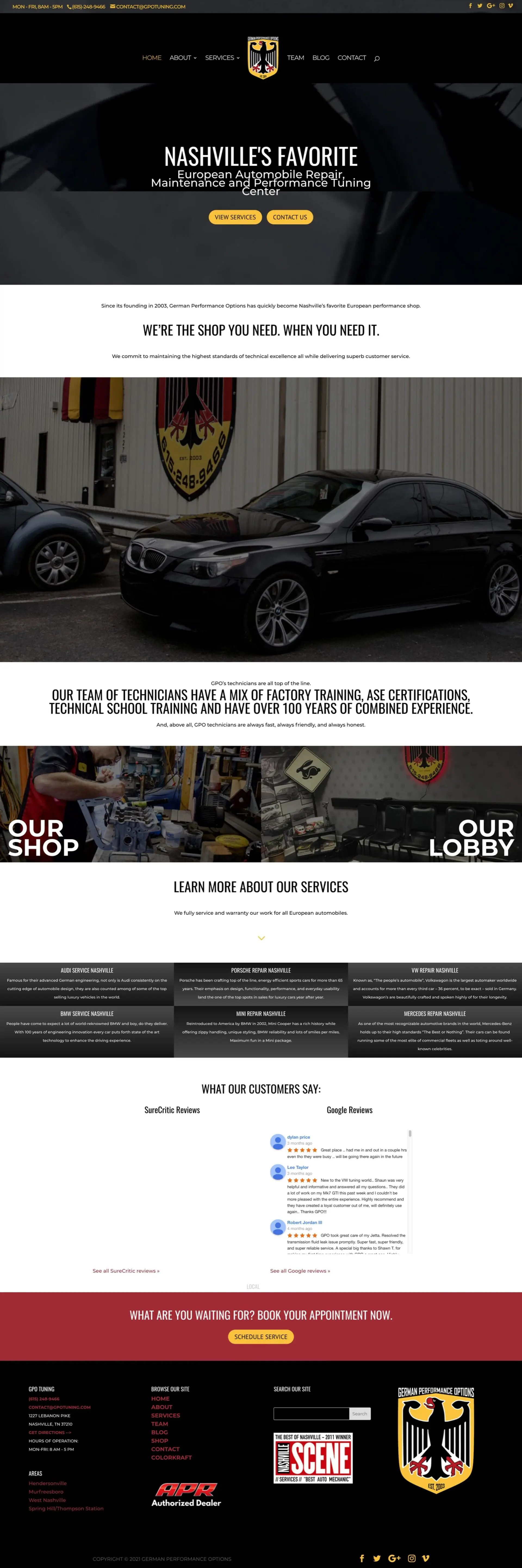 GPO Tuning, one of Nashville’s top European Car Performance & Maintenance Shops, came to Conversion First Marketing back in 2017 needing a website built with a focus on SEO. Specializing in Performance Tuning, Maintenance, and Repair of VWs, Audis, BMWs, and other German Auto Vehicles, German Performance Options (aka “GPO Tuning”) makes it their mission to provide every customer with the most professional experience. The experts at GPO Tuning have been serving the Middle TN since 2003.